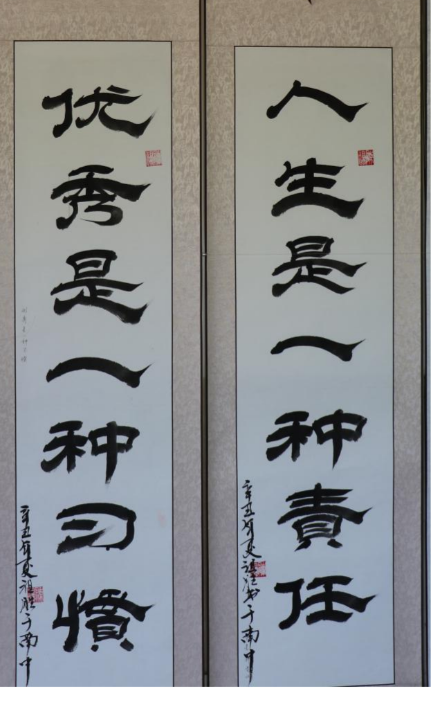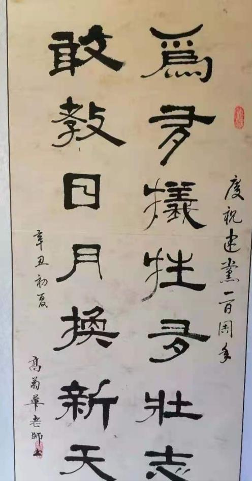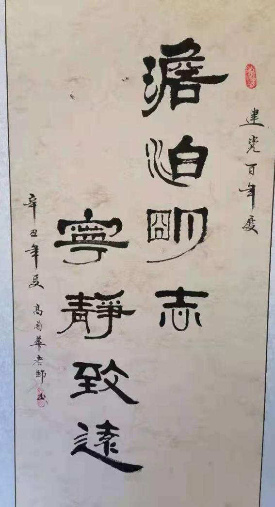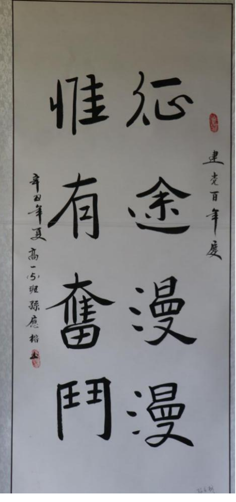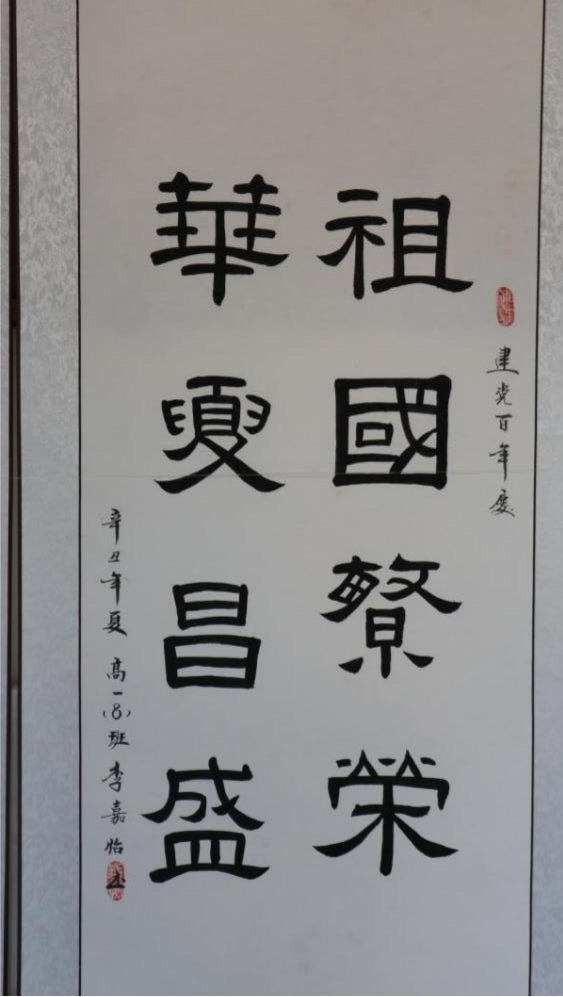 值得一提的是,为了表达对党的一片赤子心,高中部教师孙守让老师的夫人来校探亲的退休教师高菊华老师,也毅然上阵、即兴挥毫泼墨为本次展览增光添彩。