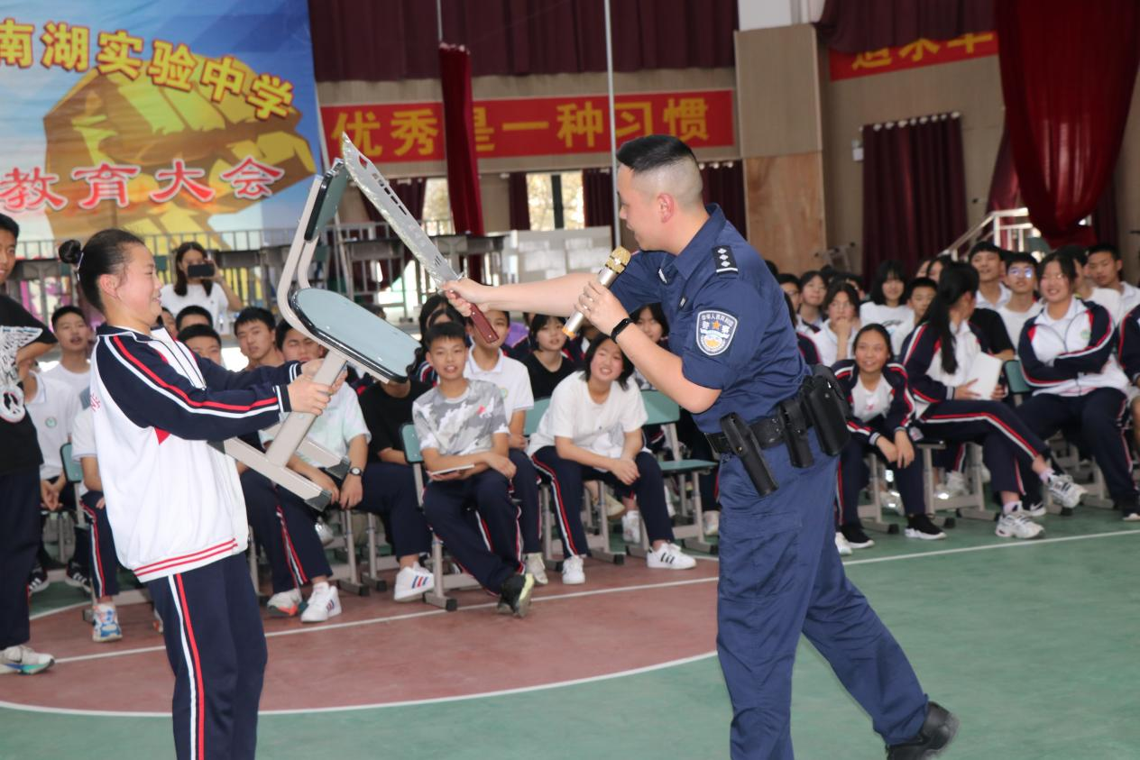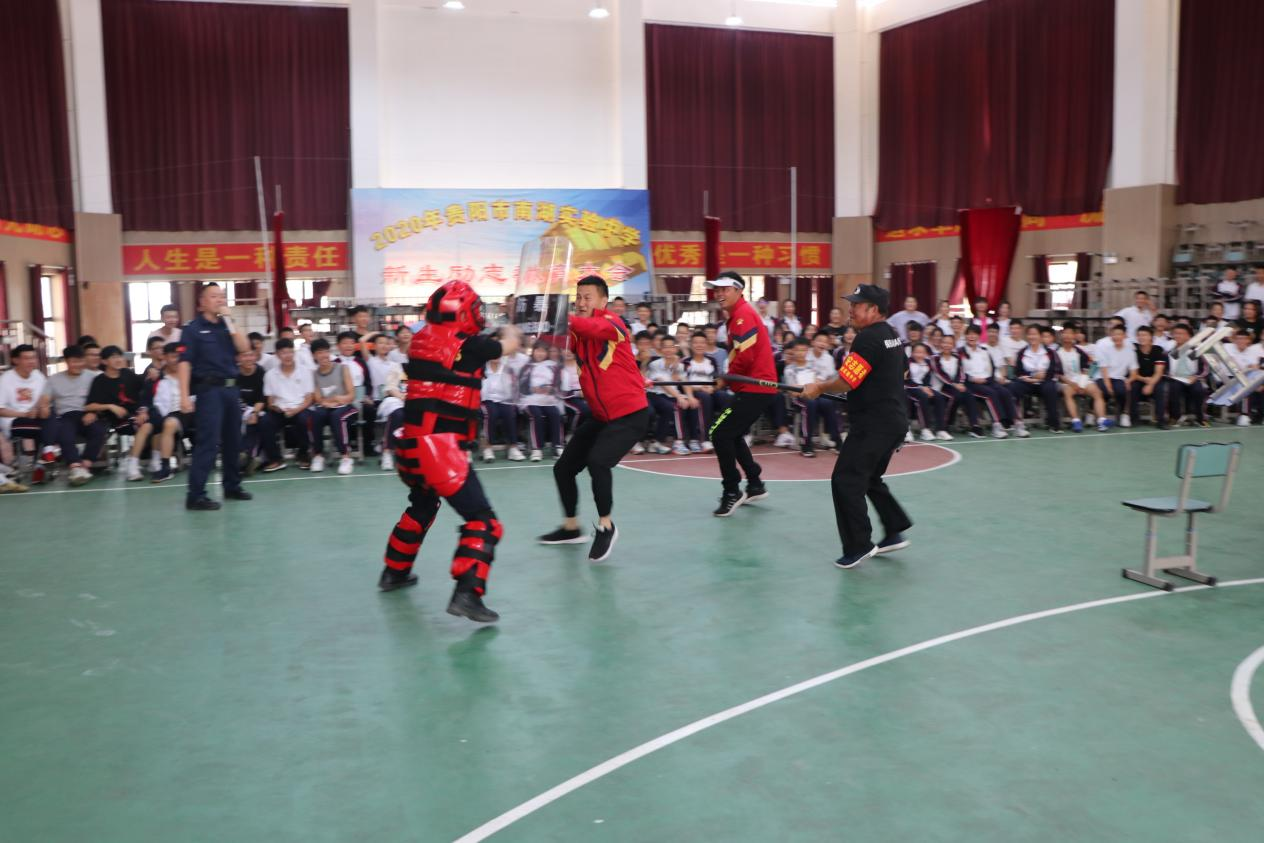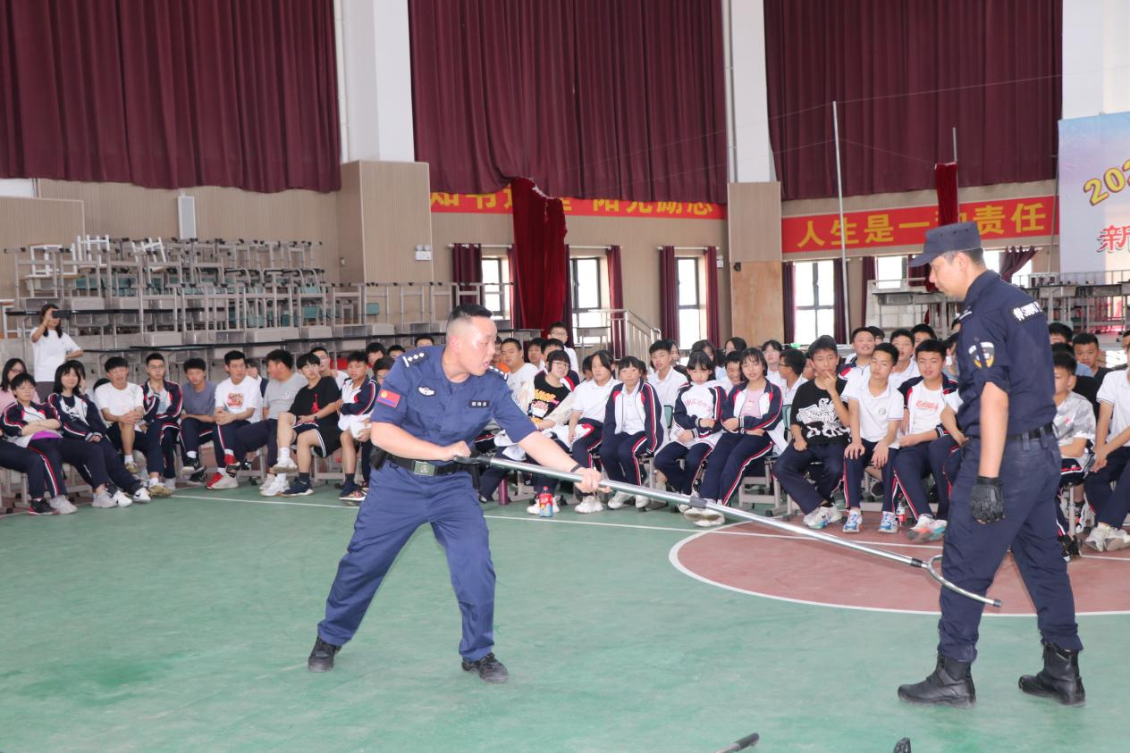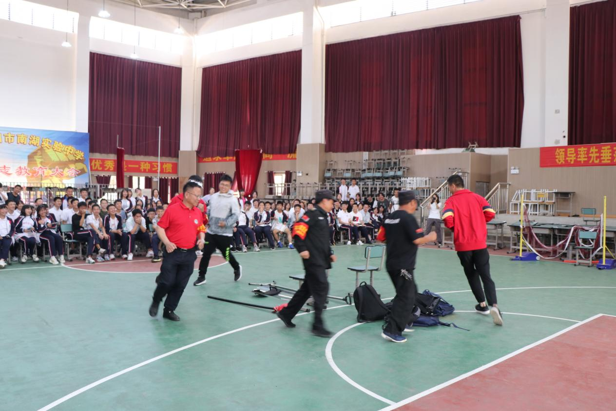 下午14:10分,讲座正式开始,首先由胡海龙警官向学生讲解了遇到个人极端暴力事件应该怎么处置,然后对保安进行器械使用的培训。最后开展了反恐演练,首先学生向雷海阳老师报告校内操场体育馆有持刀人员,学校迅速启动《金年会金字招牌至上应急预案》,通知负责校园安全的董平安、汪继承副校长,由雷海阳老师启动一键报警,紧接着护校队成员汪继承、段骏刚、雷海阳、闵松、周礼鹤、彭冲等老师和保安与持刀“歹徒”进行周旋,等待公安民警到达后,共同将“歹徒”制服。