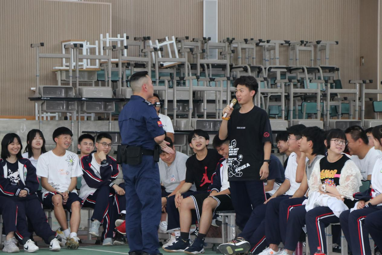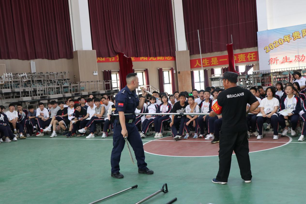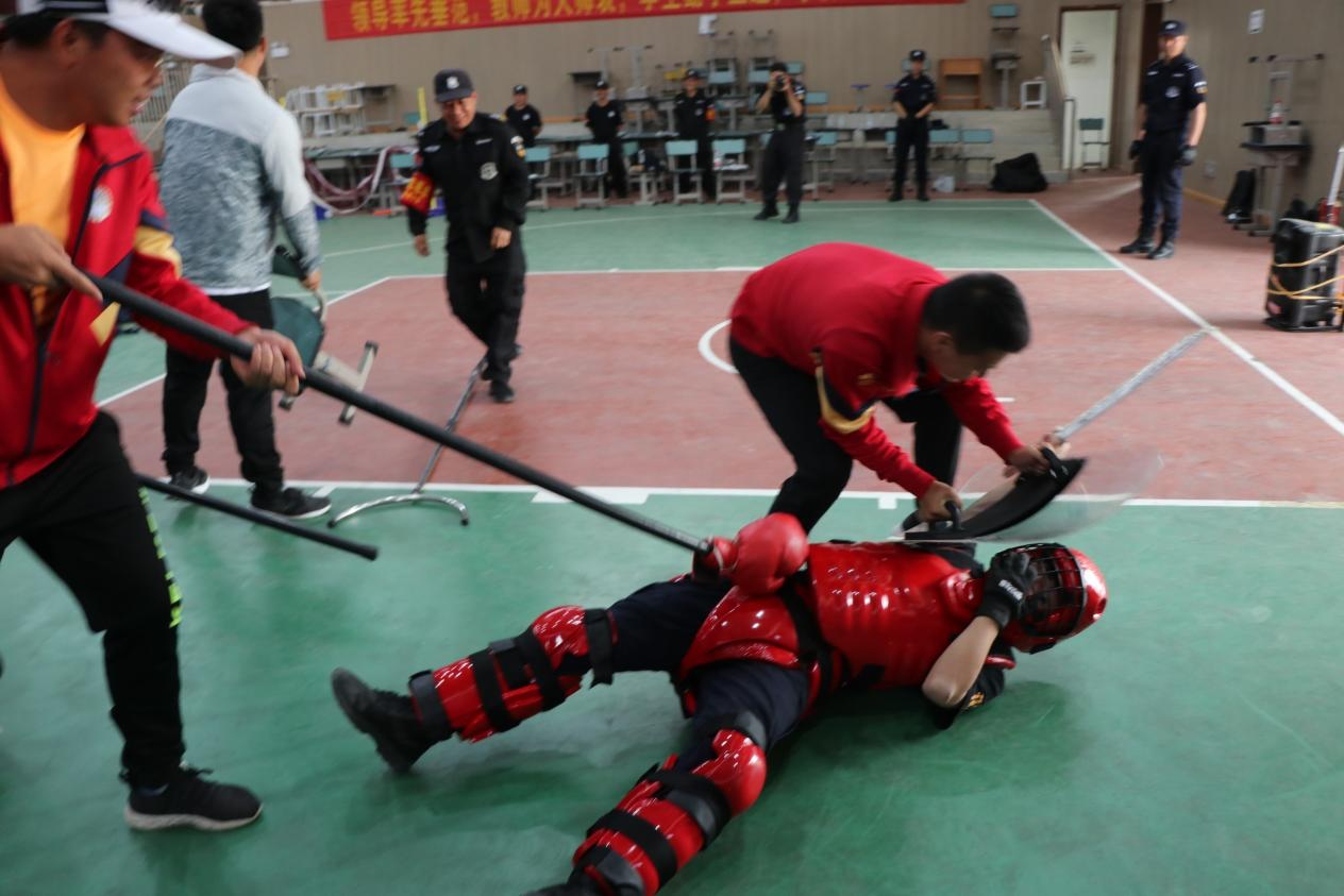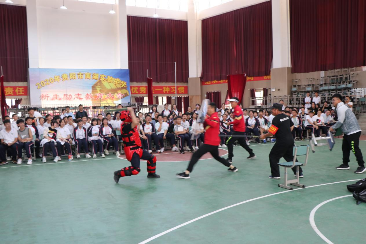 下午14:10分,讲座正式开始,首先由胡海龙警官向学生讲解了遇到个人极端暴力事件应该怎么处置,然后对保安进行器械使用的培训。最后开展了反恐演练,首先学生向雷海阳老师报告校内操场体育馆有持刀人员,学校迅速启动《金年会金字招牌至上应急预案》,通知负责校园安全的董平安、汪继承副校长,由雷海阳老师启动一键报警,紧接着护校队成员汪继承、段骏刚、雷海阳、闵松、周礼鹤、彭冲等老师和保安与持刀“歹徒”进行周旋,等待公安民警到达后,共同将“歹徒”制服。
