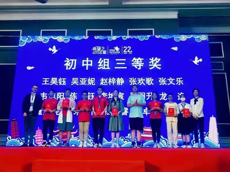 在“希望之星”全国总决赛中,我校初中部于卓希同学荣获“国家级三等奖”